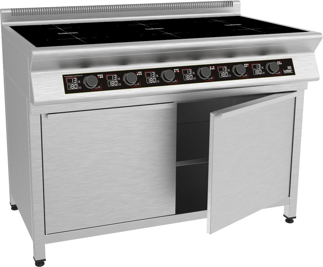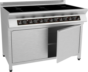 Плита индукционная на закрытой подставке, 6 конфорок мощностью 6х3,5кВт, электронная панель управления с цифровой индикацией, 13 уровней нагрева, таймер до 180мин., съемный жировой фильтр, корпус из н.с. AISI 304, регулируемые по высоте ножки, рабочая поверхность - стеклокерамика 6мм, 21 кВт, 380В, вес 89 кг.
