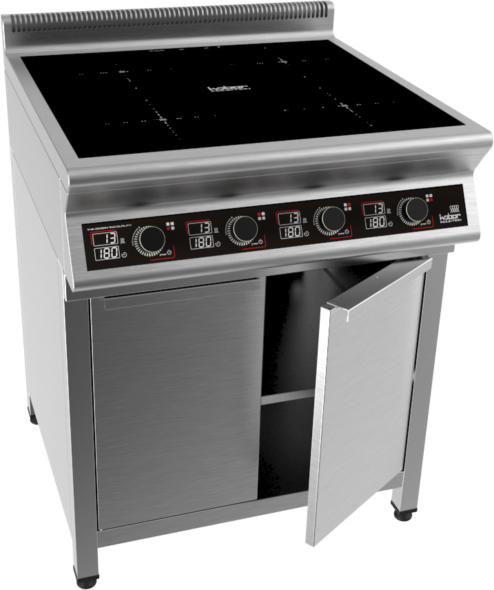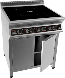 Плита индукционная на закрытой подставке, 4 конфорки мощностью 4х3,5кВт, электронная панель управления с цифровой индикацией, 13 уровней нагрева, таймер до 180мин., съемный жировой фильтр, корпус из н.с. AISI 304, регулируемые по высоте ножки, рабочая поверхность - стеклокерамика 6мм, 14 кВт, 380В, вес 78 кг.